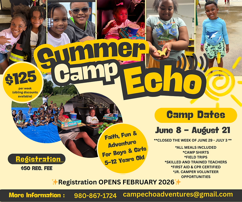 Camp Echo is a fun, faith-filled summer experience for young learners that blends adventure, creativity, and purposeful learning. Through weekly themed activities, outdoor play, hands-on projects, field trips, and age-appropriate devotionals, children explore the world around them while strengthening friendships and character. Camp Echo is designed to keep children engaged, active, and growing all summer long—spiritually, socially, and academically—while creating joyful memories that echo far beyond the season.